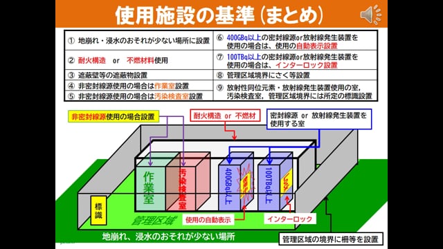 各種検査使用施設の基準使用施設の基準(非密封線源に係る基準)使用施設の基準(まとめ)使用の基準使用の基準(インターロック)使用の基準(使用場所の一時変更)使用の基準(注意事項・標識)使用の基準(非密封線源に係る基準)貯蔵施設の基準貯蔵施設の基準(非密封線源に係る基準)貯蔵施設の基準(まとめ)保管の基準廃棄の委託放射能標識