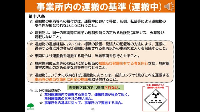 事業所内における運搬の基準事業所内の運搬の基準(基準値)事業所内の運搬の基準(運搬中)事業所外の運搬の基準全ての放射性輸送物の共通基準L型輸送物の基準A型輸送物の基準輸送物の基準輸送物の標識