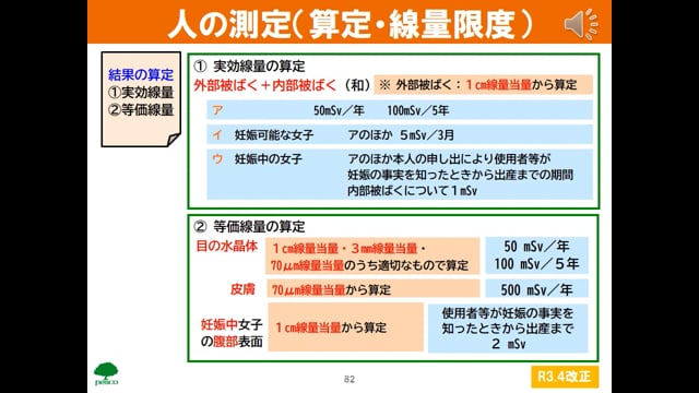 測定の義務場所の測定(放射線の量)測定の場所(汚染の測定)(記録)人の測定(外部被ばく線量①)人の測定(外部被ばく線量②)人の測定(内部被ばく線量)人の測定(汚染の状況)人の測定(結果の集計・算定)人の測定(算定・線量限度)人の測定(記録の扱い)