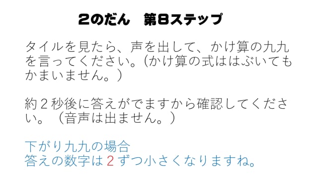 1の段から始めて2→5→3→4→6→7→8→9→0の順序ですることをお勧めします。その方が発達の遅い子供であっても数字が簡単であるために直感的にかけ算の仕組みが分かりやすいからです。