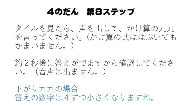 速さ1、速さ2、速さ3の3種類ありますので、どのスピードが自分に合っているか1の段で試してから、この教材をお使いください。1の段から始めて2→5→3→4→6→7→8→9→0の順序ですることをお勧めします。その方が発達の遅い子供であっても数字が簡単であるために直感的にかけ算の仕組みが分かりやすいからです。1の段 第1ステップ から始めましょう。1の段のみ第2ステップはありません。