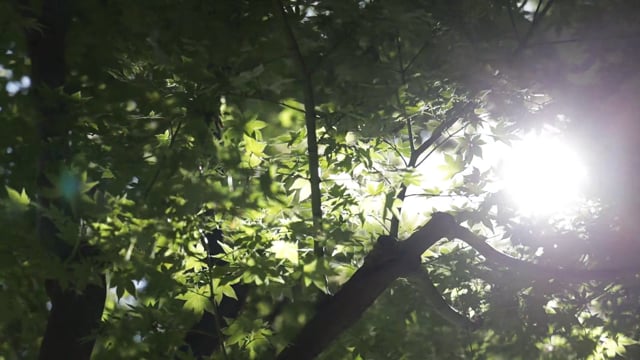 10月、強めの日差しの中、風に吹かれる紅葉の葉
