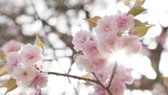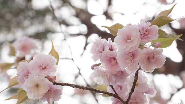 光を背負いながら、風に揺れる満開の八重桜を撮影。花の間から差し込む太陽光が綺麗にとれたと思います。