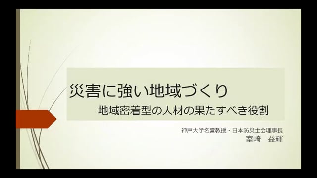 基調講演:『(仮)災害に強い地域づくり 地域密着型の人材の果たす役割』 室﨑益輝氏(神戸大学名誉教授、NPO法人日本防災士会 理事長)