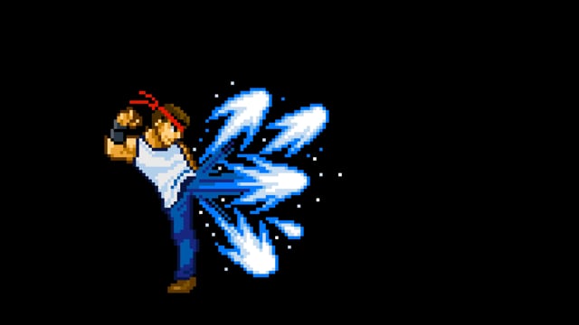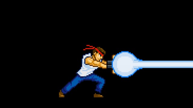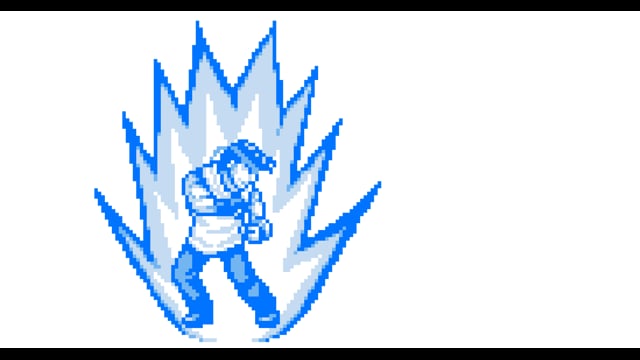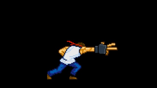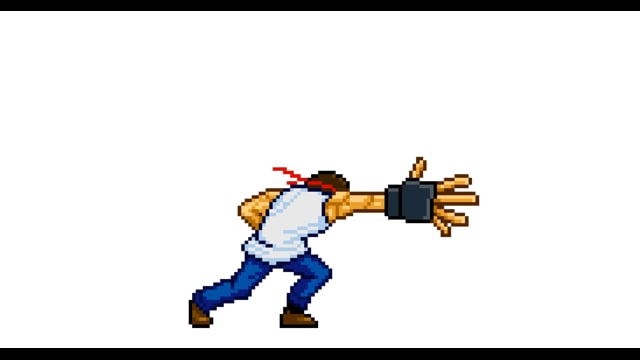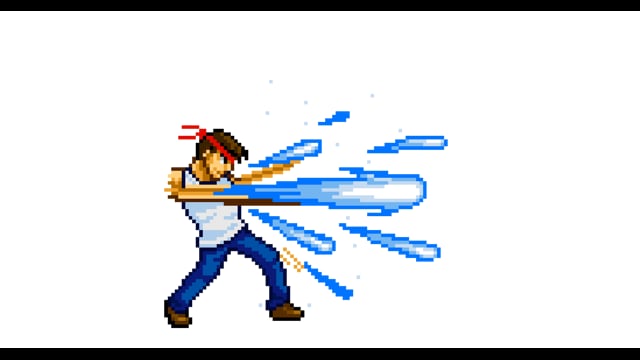 Tシャツを着た男性格闘家が手からエネルギーを出すドット(ピクセルアート)の動画です。