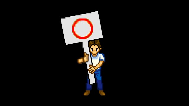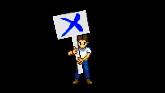 これは、Tシャツを着た男性が大きなバツを出している、 ピクセルアートの作品です。 背景は透過しています。
